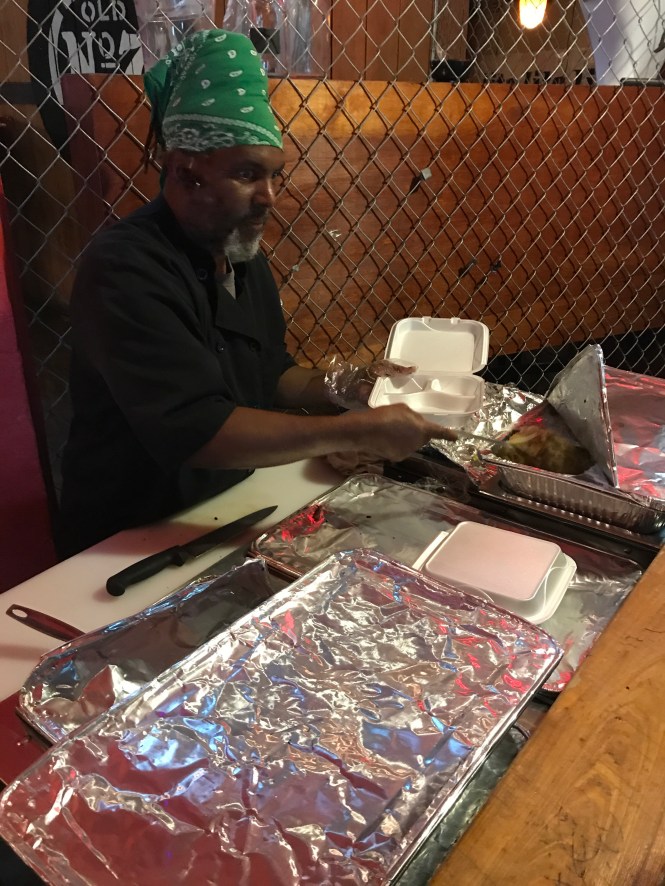 Once we were inside, the smell of Jamaican cuisine was in the air. Immediately, my mouth started watering. I asked Fast Eddie if he was ready to “go in” on some of Chef Irie’s Jerk Chicken and I go that “Let’s do this head-nod.” Chef Irie’s menu included jerk chicken, ox tail, curry chicken, red snapper, brown stew chicken, beef patties, and the delicious sides (cabbage & red beans/rice). We went with the the jerk chicken, ox tail and a little sample of the brown stew chicken. Also, we washed down the deliciousness with good old Red Stripes.