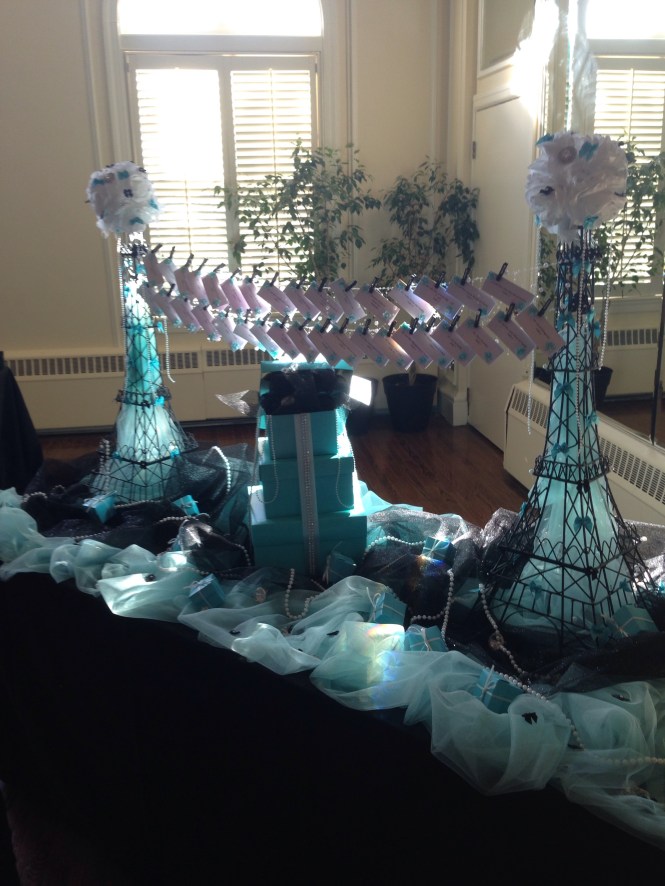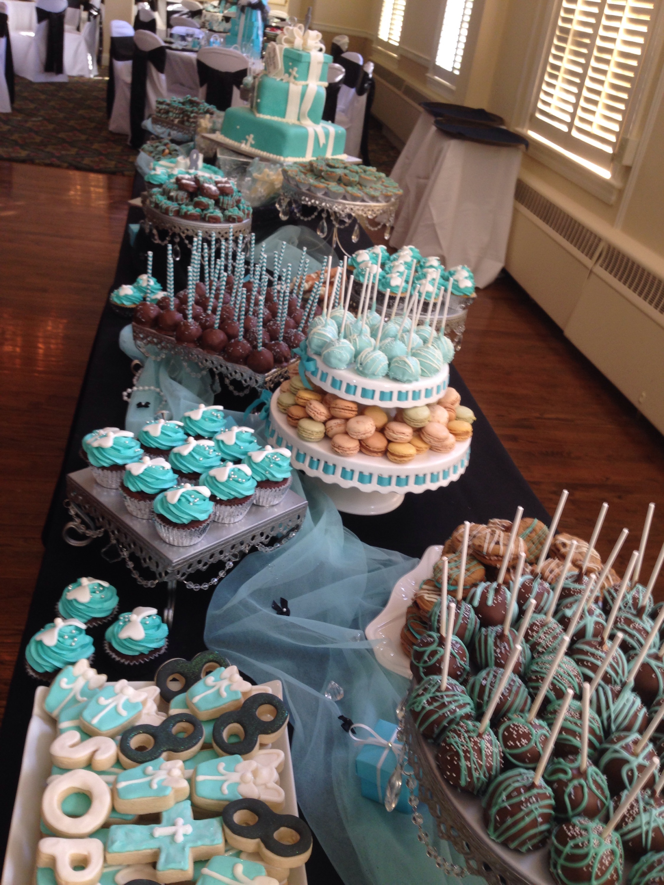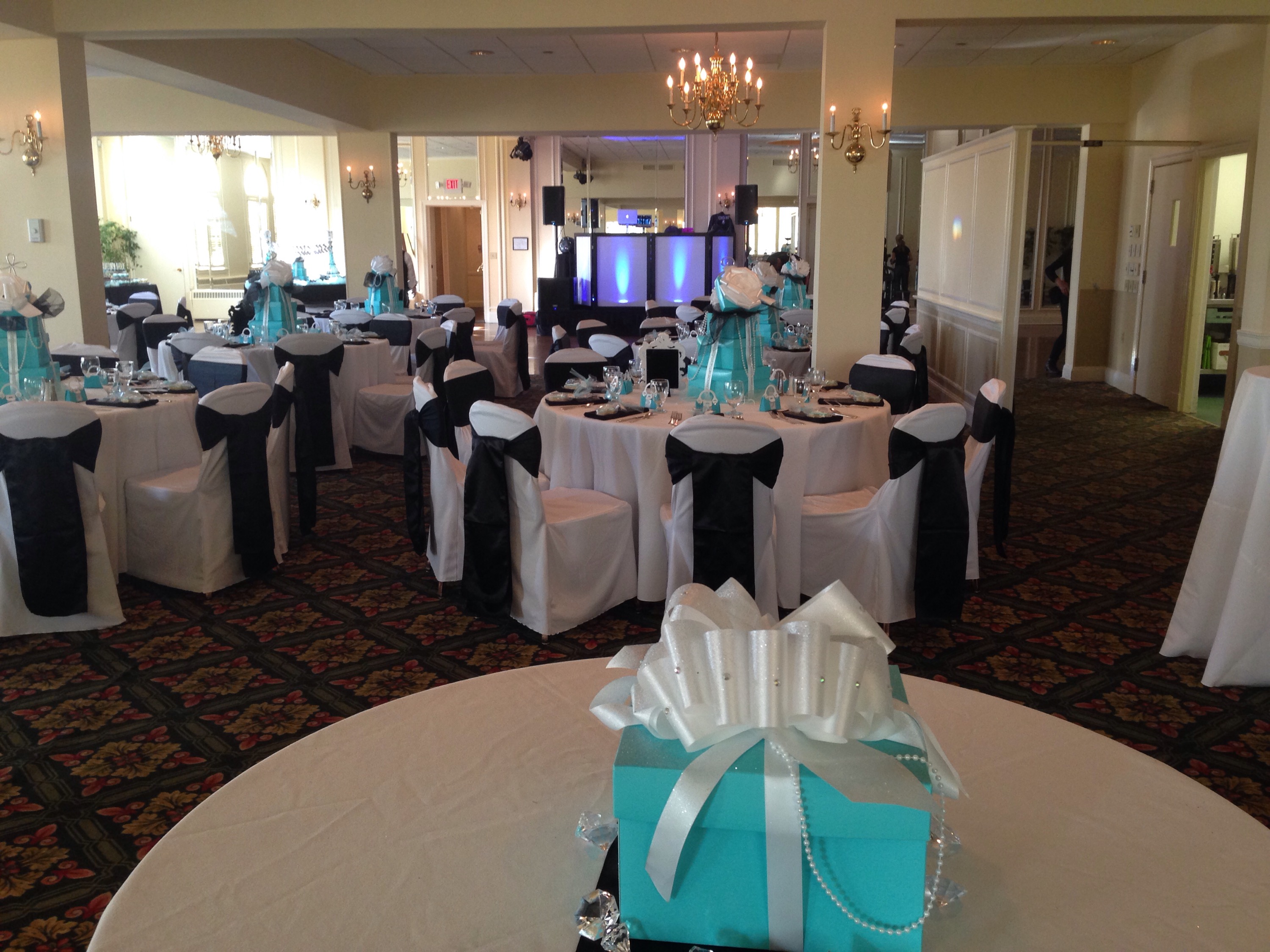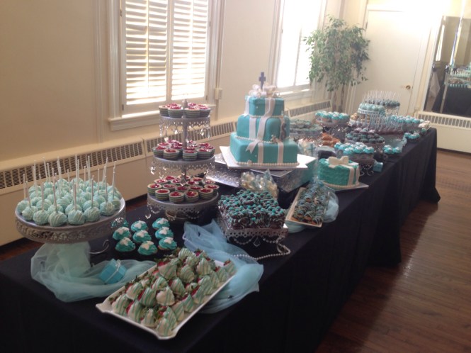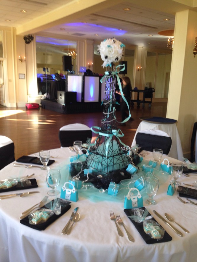 I really enjoy doing events at the Trenton Country Club, as it always reminds me of the movie, “Caddyshack”. Not that there’s a gopher going around pulling pranks on the golfers, but I truly enjoy the overall venue. The staff is tremendously helpful and kind to everyone! Also, the food is amazing!  Below, I’ve shared a few photos of us setting up for the festivities. The them for this party was Tiffany’s and all the decorations made the room look amazing.     I’m not really big on desserts, but how could anyone pass up this smorgasbord?    All the cakes and cookies were customized for the event, which added a personal touch!     Once we did our sound check, we started welcoming the guest with light cocktail music and top 40 hits.