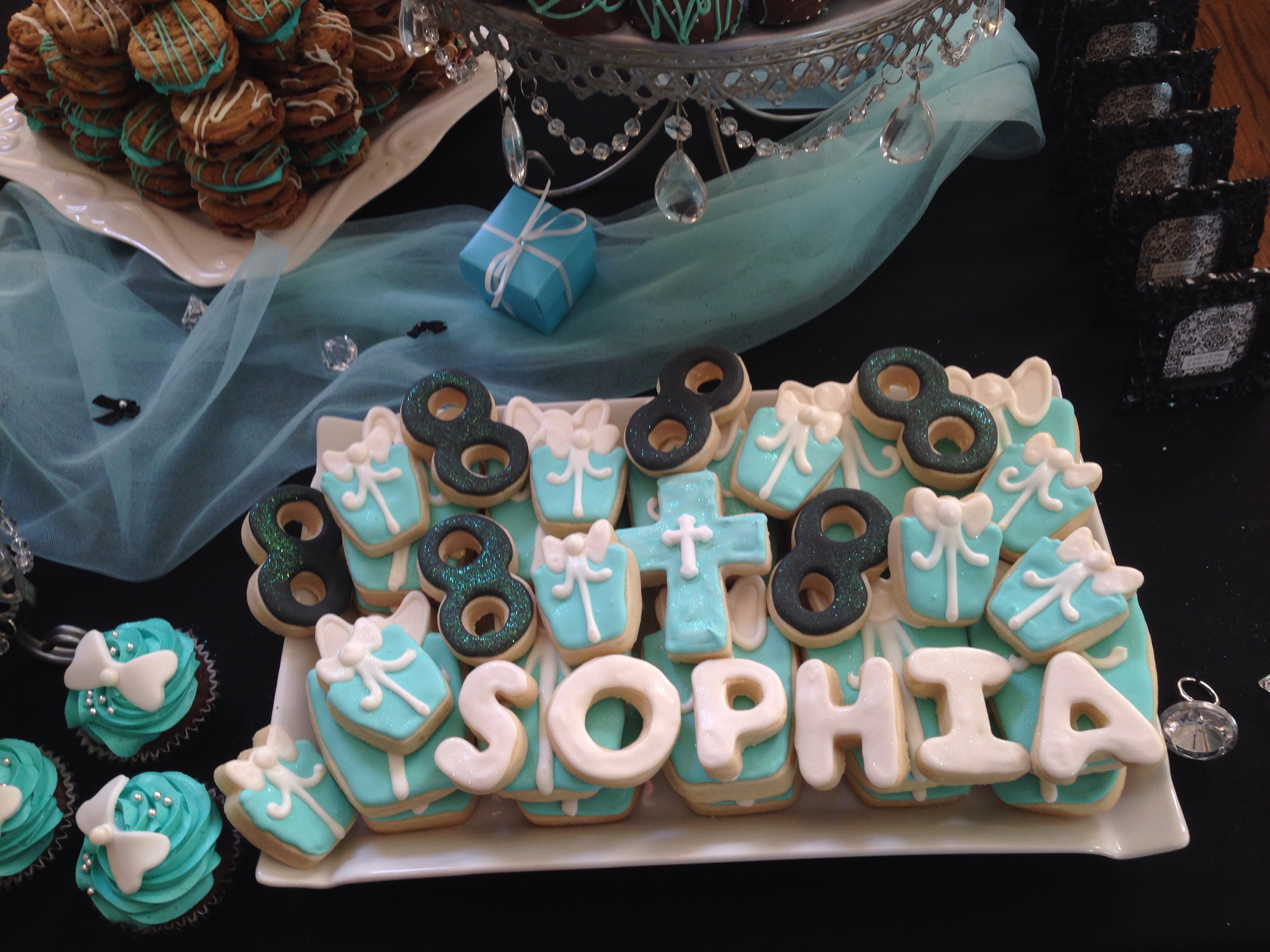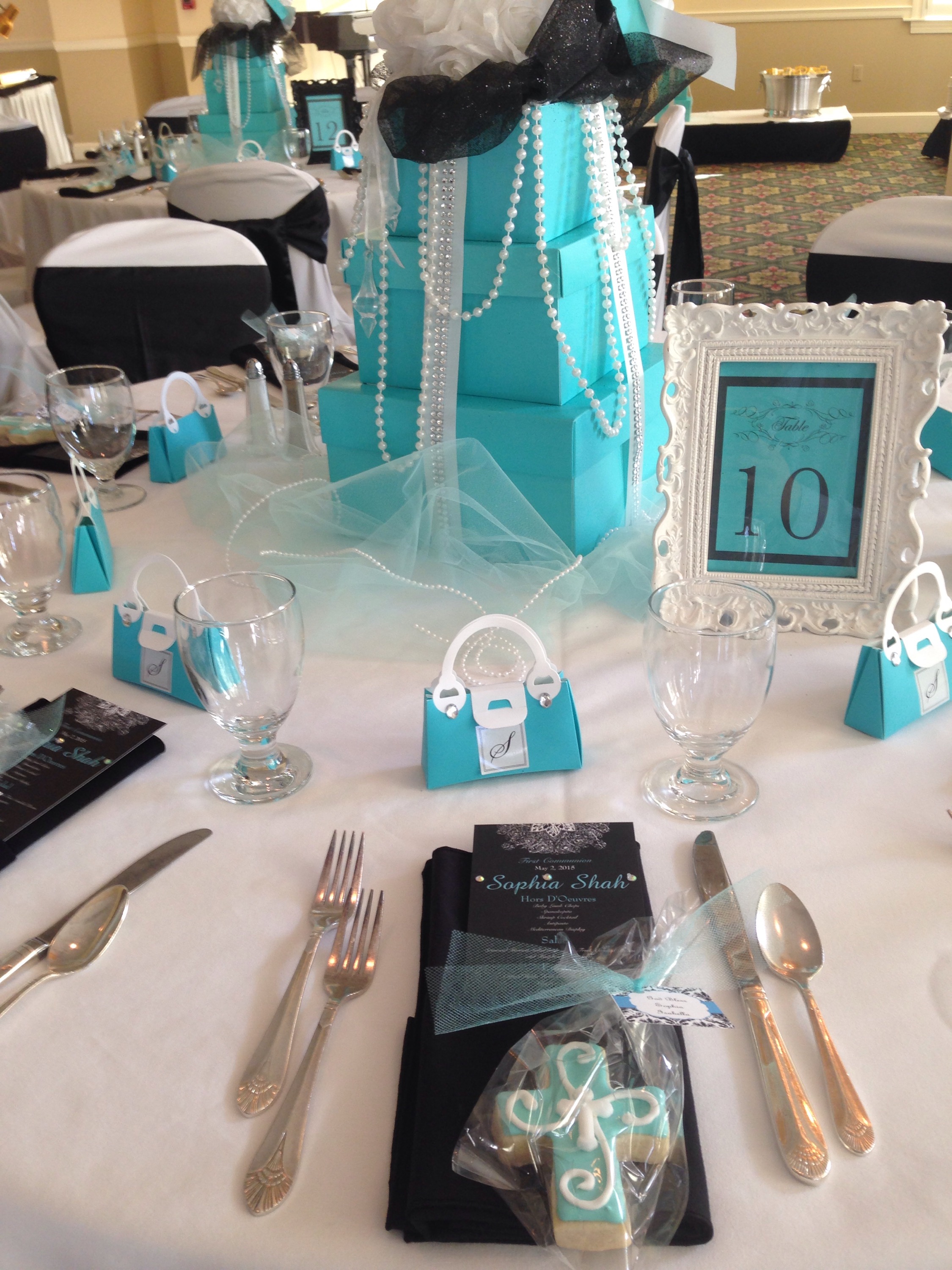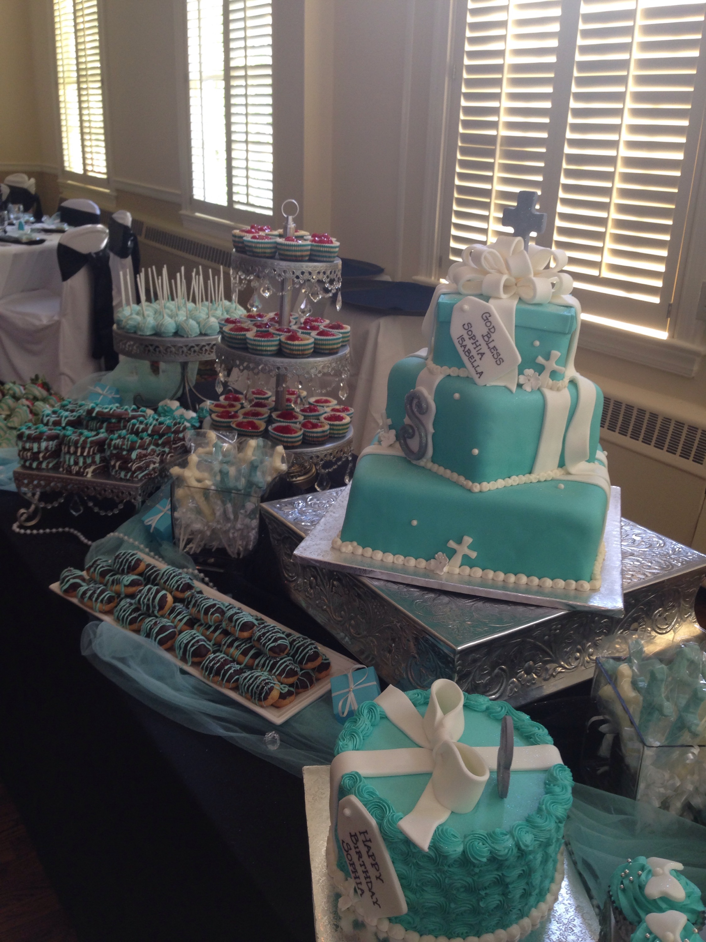 I really enjoy doing events at the Trenton Country Club, as it always reminds me of the movie, “Caddyshack”. Not that there’s a gopher going around pulling pranks on the golfers, but I truly enjoy the overall venue. The staff is tremendously helpful and kind to everyone! Also, the food is amazing!  Below, I’ve shared a few photos of us setting up for the festivities. The them for this party was Tiffany’s and all the decorations made the room look amazing.     I’m not really big on desserts, but how could anyone pass up this smorgasbord?    All the cakes and cookies were customized for the event, which added a personal touch!     Once we did our sound check, we started welcoming the guest with light cocktail music and top 40 hits.